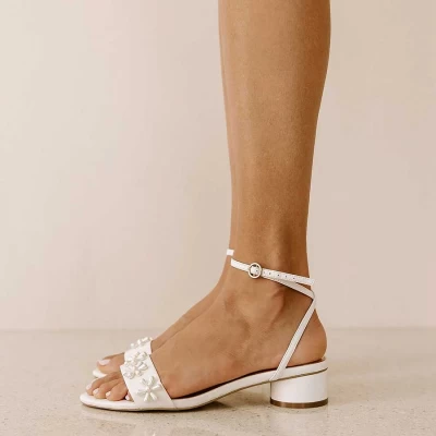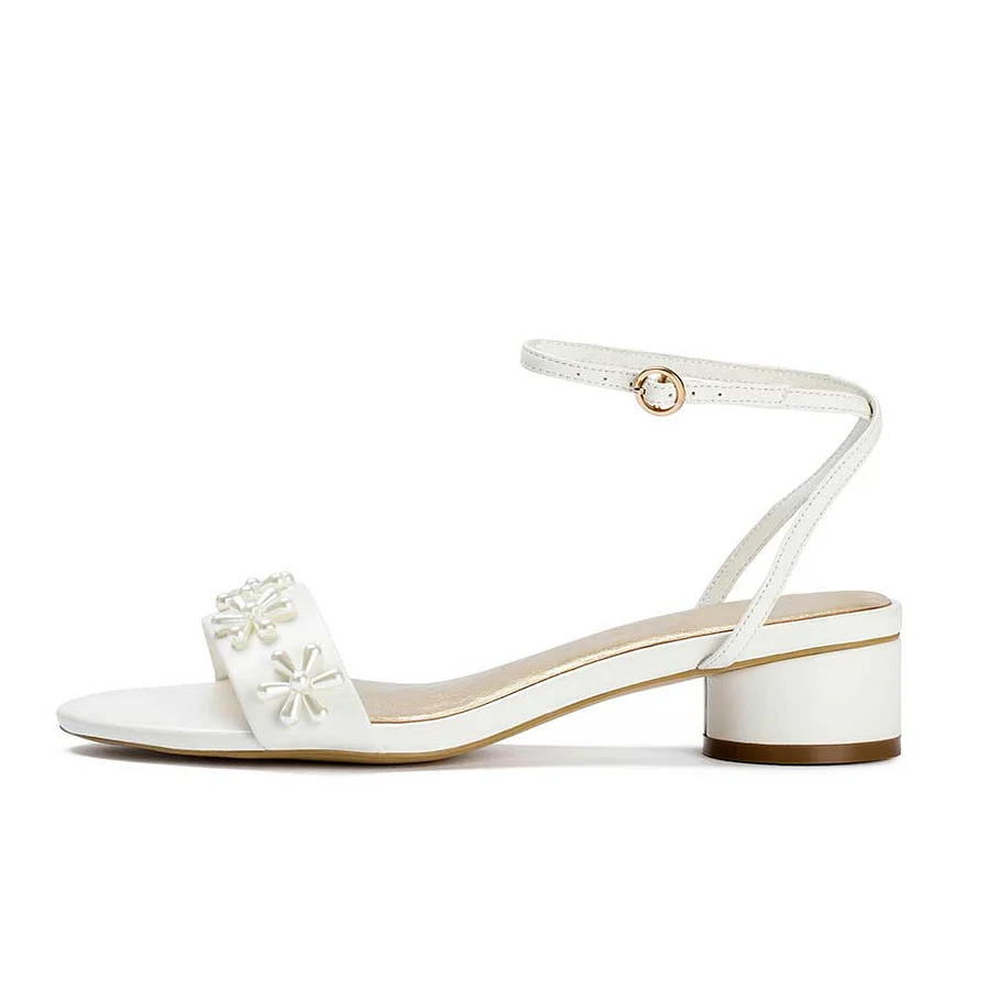 Ivory Low Chunky Heel Wedding Shoes Ankle Strap Floral Pearl Sandals